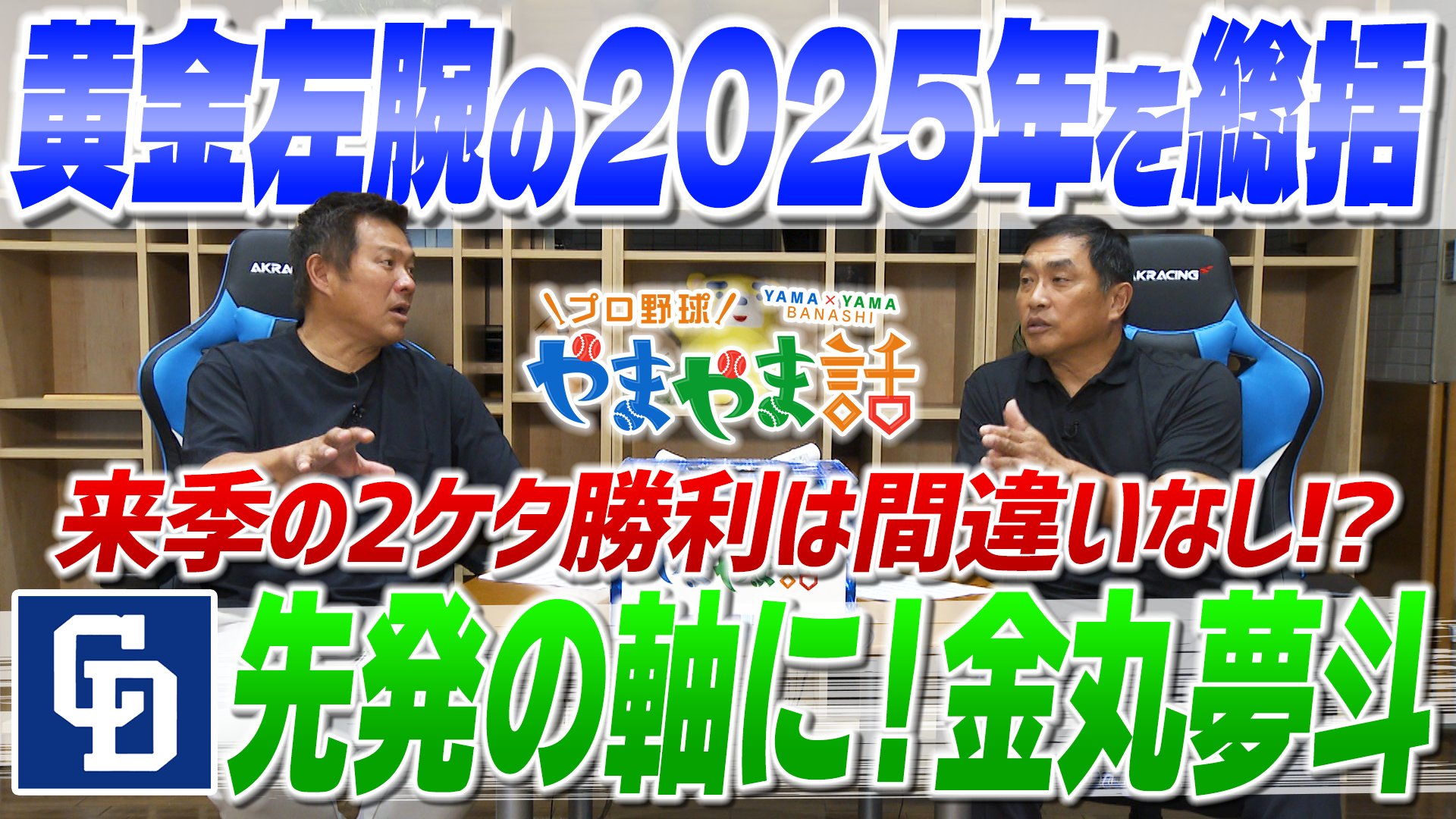 4球団競合の末、井上監督が引き当てた 黄金ルーキー・金丸夢斗投手。 キャンプから慎重に段階を踏んで、 5月に一軍デビューしましたが、 なかなか勝ち星には恵まれませんでした。 山本昌さんと山﨑武司さんのお2人は、 2勝6敗というルーキーイヤーの成績を どのように評価しているのか? そして、どうすればもっと勝てるのかを徹底分析! そのうえで、来シーズンは2ケタ勝利間違いなしの太鼓判も!!