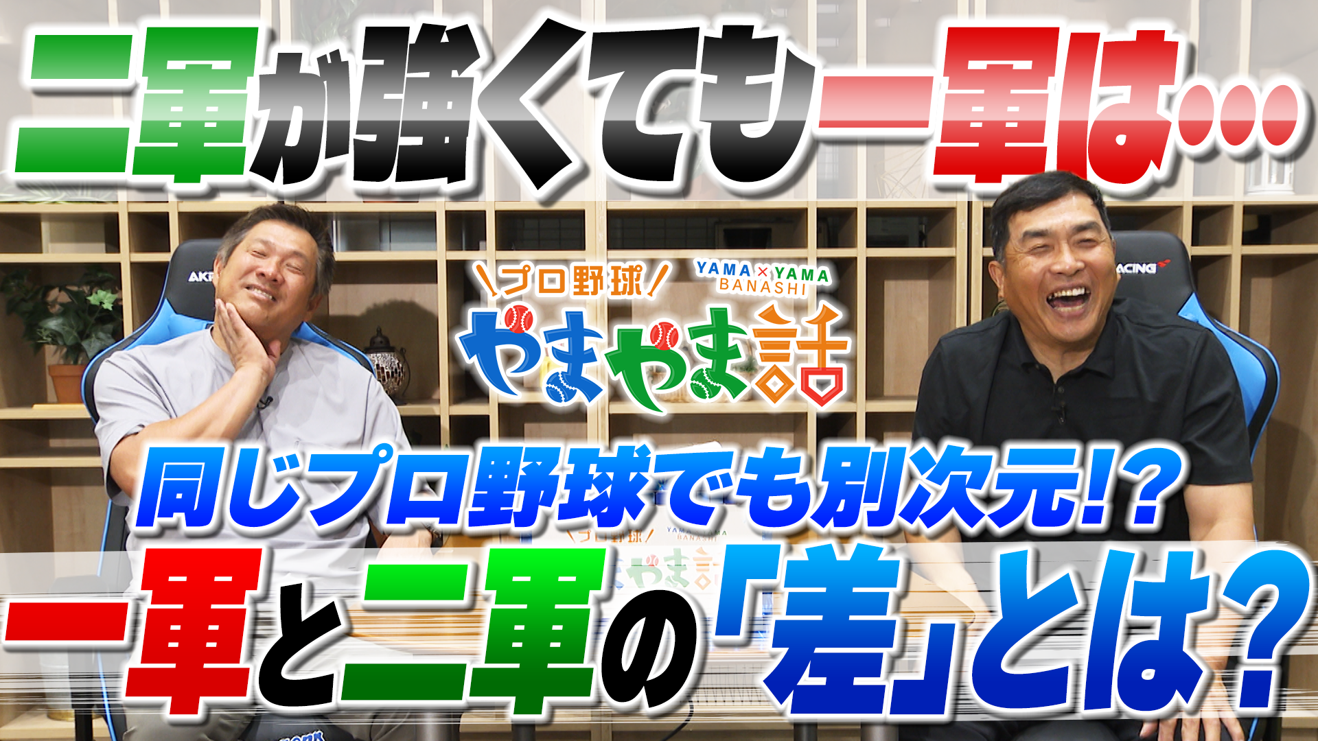 まもなく今季のペナントレースも折り返し。 中日は6月15日現在で「借金3」と、 勝率5割復帰をなかなか果たせない状況です。 一方、ファームに目を向けると、中日は6月15日現在で「貯金15」。 2位ソフトバンクに5ゲーム差をつけ、首位を独走しています。 昨季も最後まで優勝争いを繰り広げ2位。 ウエスタン・リーグでは“常勝軍団”の地位を築き始めています。 もちろん、「ファーム」というだけあって、二軍はあくまでも 「育成の場」にすぎない、という考え方もありますが、 なぜ一軍は借金生活を送っているのに、二軍は2ケタの貯金ができるのか? 誰もが気になる「一軍と二軍の差」について、やまやまコンビのお2人が 実体験をもとに検証します。