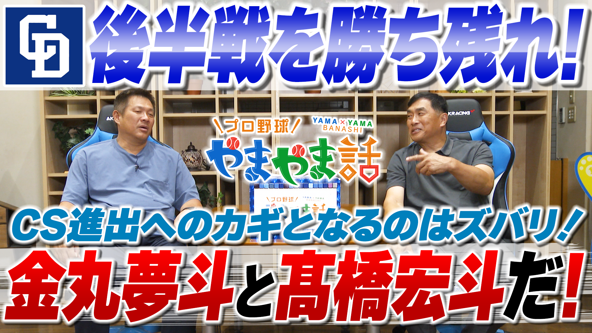ペナントレースも折り返し地点を過ぎ、 オールスターが明けるといよいよ勝負の後半戦が待ち構えています。 各チームともこれからが正念場。 特にドラゴンズは、主力に故障者が出てしまったこともあり、 残りの試合もやや苦戦の予感が… とはいえ、CS進出圏内の3位までは、そこまで大きな差になっておらず、 今後の戦い次第では十分に巻き返し可能。 そこで、今回はやまやまコンビのお2人が、後半戦に向けて、 ドラゴンズでカギを握る選手をピックアップ! 上位進出は、ここまで黒星が先行している同学年の2人にかかって いるようです。
