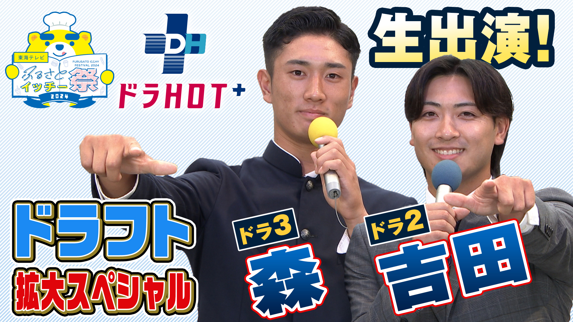 東海テレビふるさとイッチー祭での公開生放送の模様を配信。 ゲストには、ドラフト会議で指名されたドラフト2位吉田聖弥投手(西濃運輸)とドラフト3位森駿太選手(桐光学園高)が登場! そしてもう一人のスペシャルゲスト、高校野球大好き芸人のかみじょうたけしさん、ドラHOTおなじみ山本昌さん、山﨑武司さんとともに、ドラフト裏話もたっぷりお伝えします! ※情報内容は放送当時のものです 出演者 【MC】 峰竜太・篠田愛純 【解説】 山本昌・山﨑武司 【ゲスト】 かみじょうたけし 吉田聖弥投手(西濃運輸) 森駿太選手(桐光学園高)