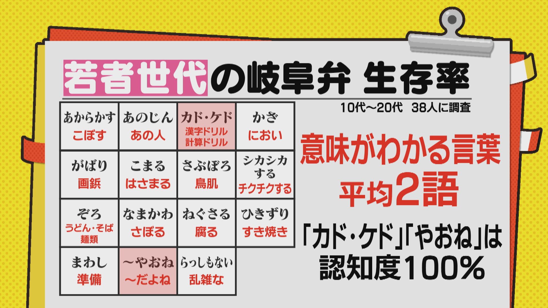 今回のあらゆるサーチは、“岐阜弁の生存率”を大調査! 「あのじん」、「まわし」などの強い岐阜弁が続々登場! さらに、「カド・ケド!」若者たちの認知度100%な学校だけで使われている岐阜弁とは?