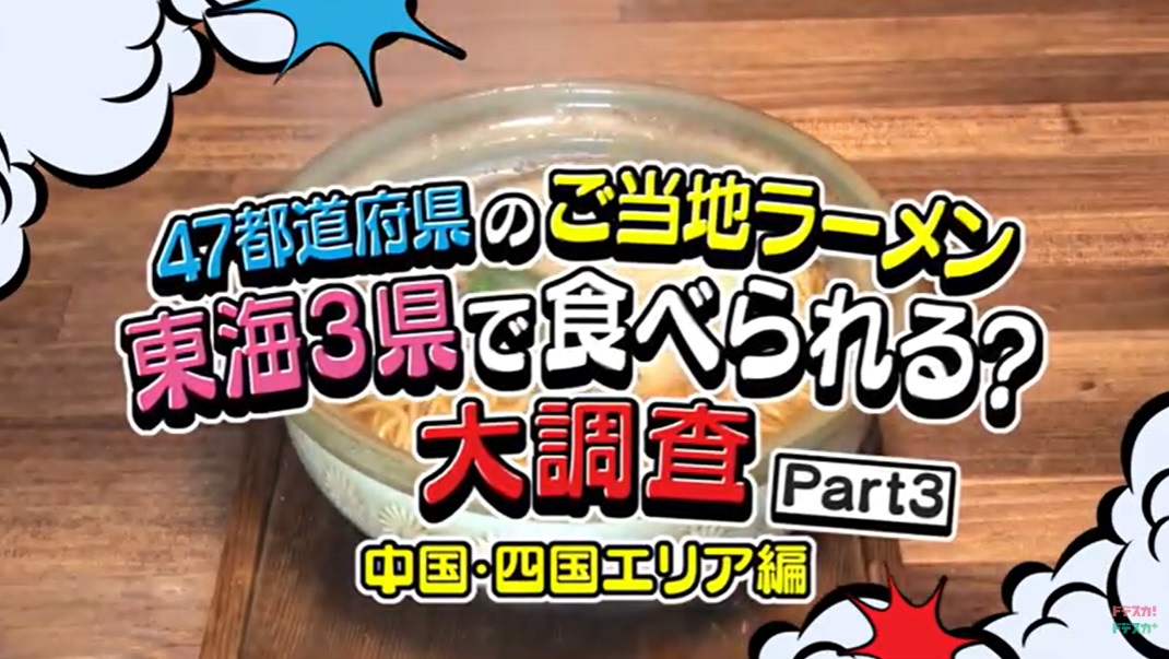 47都道府県のご当地ラーメン、東海3県で全部食べられるかを大調査! 第1弾は「北海道~関東エリア」、第2弾は「中部~関西エリア」を調査し、これまでに26都道府県のラーメンを発見してきました。 そして今回は、第3弾「中国・四国エリア」です。 調査ルールは、「日本ご当地ラーメン一覧2024」を参考に東海3県内にある店を探し、お店の人が「ご当地ラーメン」と言えばOK。 宍道湖のしじみ、瀬戸内のいりこをスープに使っているものから、激辛つけ麺も。 さらに名古屋市熱田区で発見した「日本一熱い」ご当地ラーメンとは!? (2025年7月9日放送 メ~テレ『ドデスカ!』より)
