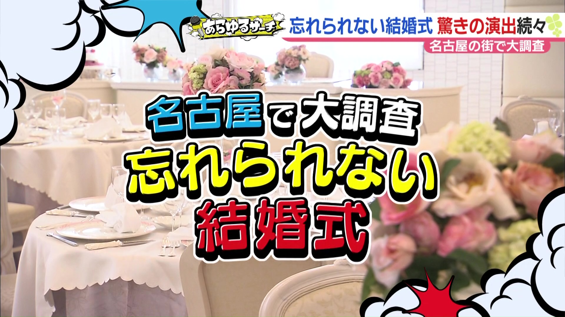 〝あらゆる〟ギモンを徹底調査「あらゆるサーチ」。 2人の新しい門出となる結婚式。実は11月は1年で最も結婚式を挙げる人が多い月なんです。 そこで、名古屋で「忘れられない結婚式」を大調査! ペンライトを振る演出でアイドル気分の結婚式に、馬で登場した新郎まで! 感動した演出からハプニングが起きた結婚式も。 さらに名古屋らしさ全開のド派手な演出に最新トレンドもご紹介!
