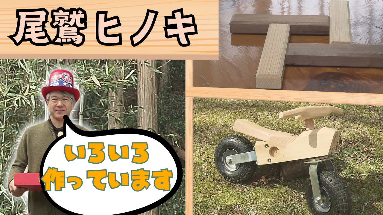 今回の舞台は三重県紀北町です。名物はマンボウ! 町には大きなモニュメントもあり、フライにするなど様々な料理として食べられているんです!!他にも伊勢海老やカツオなど、海の幸が豊富! さらに魅力はそれだけではなく、自然豊かな紀北町が誇る特産品が「尾鷲ヒノキ」。 「中井木工」では尾鷲ヒノキを使った商品を作っています。椅子やテーブルなどの家具はもちろん、名刺入れに、鍋敷き、木でできたバイクまで。中井さんが作る商品は全て受注生産です。